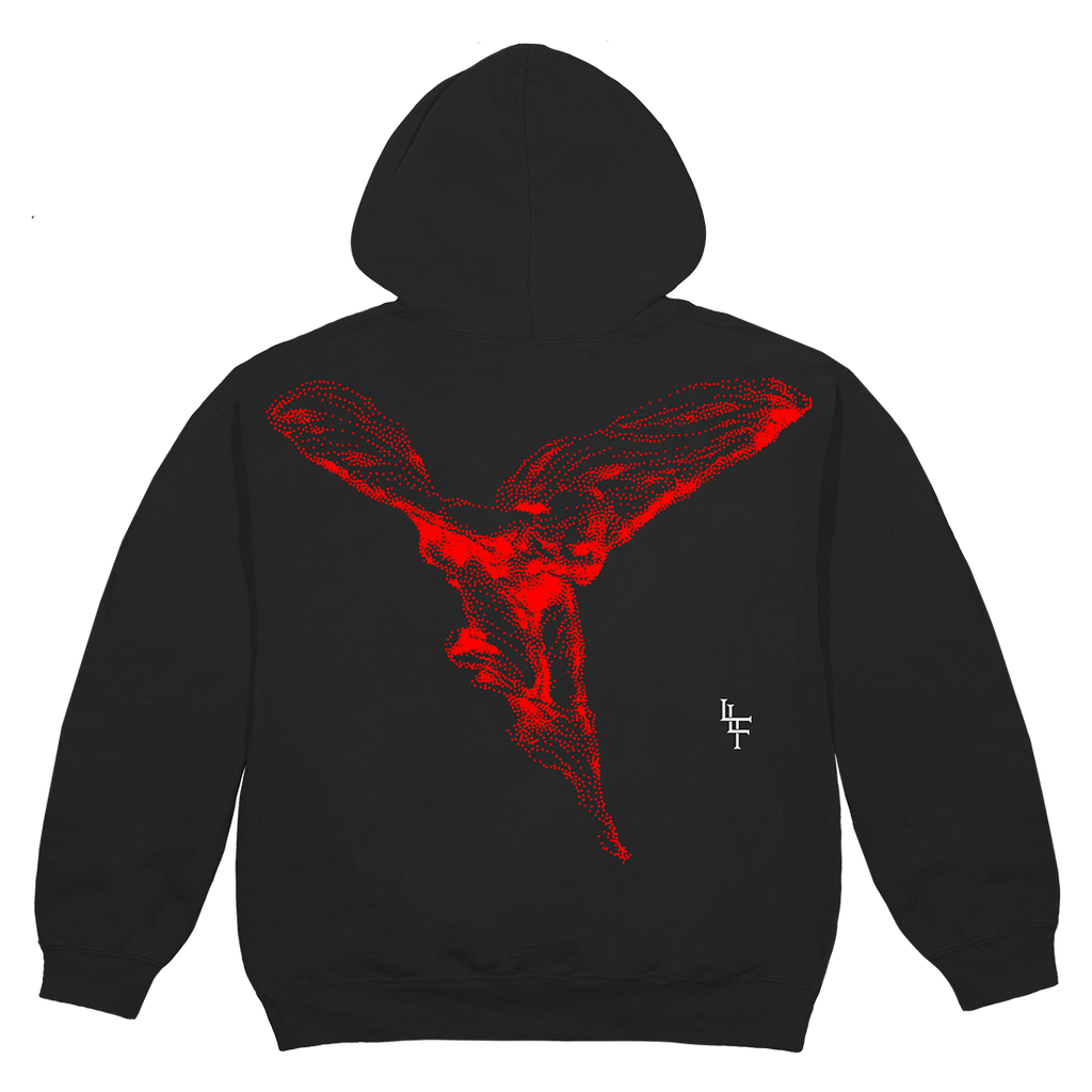 The “Live Life Fast Angel Hoodie” from Roddy Ricch features text on the front and an angel design on the back of a black unisex pullover hoodie.