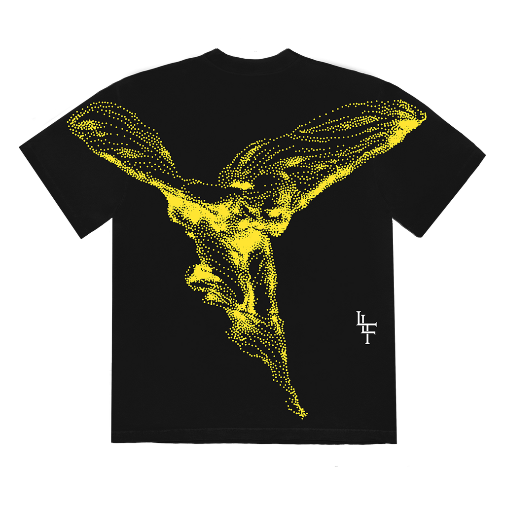The “Live Life Fast Angel T-Shirt” from Roddy Ricch features text on the front and an angel design on the back of a black unisex t-shirt.