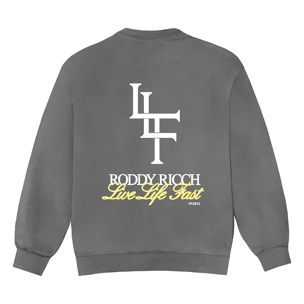 The “LLF Angel Crewneck” from Roddy Ricch features an angel design on the front and text on the back of a grey unisex pullover crewneck.